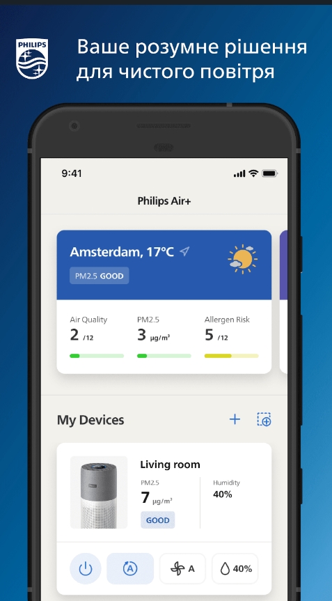 Приложение Philips Air+ превращает очиститель воздуха в интеллектуальную систему, которая сама заботится о чистоте и здоровом микроклимате в вашем доме. Оно автоматически регулирует работу устройства, анализируя качество воздуха в помещении и внешней среде, чтобы вы могли просто дышать полной грудью.