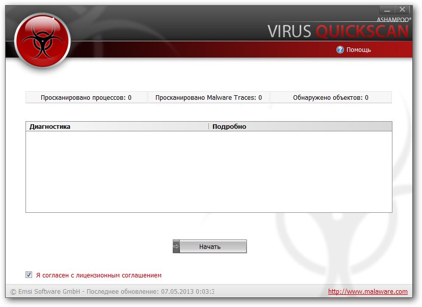 Ashampoo Virus Quickscan Free - бесплатная утилита, которая мгновенно обнаруживает и удаляет инфекции на компьютере. Простая в использовании утилита, позволяет осуществлять очень быстрое сканирование ПК, предупреждает пользователя о наличии активных вирусов, spyware и malware и предлагает их удалить. Поиск вирусов осуществляется при помощи двух мощных алгоритмов сканирования, а наличие "облачной" технологии позволяет обнаруживать последние угрозы.