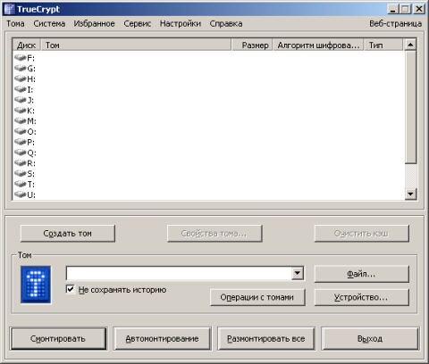Для подключения созданного контейнера в главном окне программы нажмем кнопку "Файл", выберем созданный контейнер, укажем в верхнем списке букву диска, на которую будет подключен контейнер, и нажмем кнопку "Смонтировать". Можете убедиться, что в системе появился новый диск. На него теперь можно записывать рабочие данные. По завершении работ закроем все приложения, работавшие с контейнером, и отключим диск, нажав в главном окне TrueCrypt кнопку "Размонтировать".