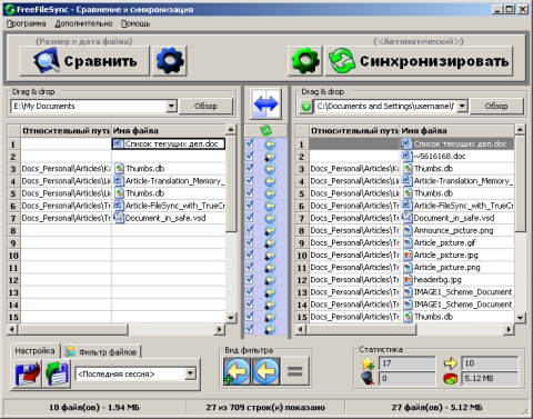 Главное окно программы состоит из двух панелей, отображающих содержимое пары синхронизируемых каталогов. После выбора каталогов можно нажать кнопку "Сравнить", программа проверит содержимое каталогов и отразит различия. Нажатие кнопки "Синхронизировать" запустит процедуру обмена файлами, по завершении которой каталоги будут одинаковыми. Вот, собственно, и все. Понятно, что можно выполнить все действия вручную и так делать по нескольку раз в день, но, чтобы было действительно удобно, процесс надо автоматизировать, поэтому следующим шагом создадим задание.