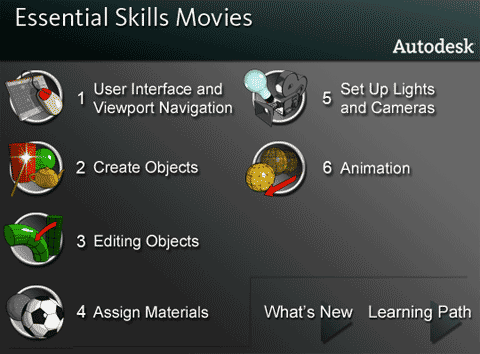 Такое сложное ПО, как 3ds Max, нуждается в большом количестве обучающего материала. Autodesk серьезно подходит к этому вопросу, поэтому уже при запуске программы пользователь может ознакомиться с видеороликами, показывающими базовые возможности - Essential Skills Movies.
