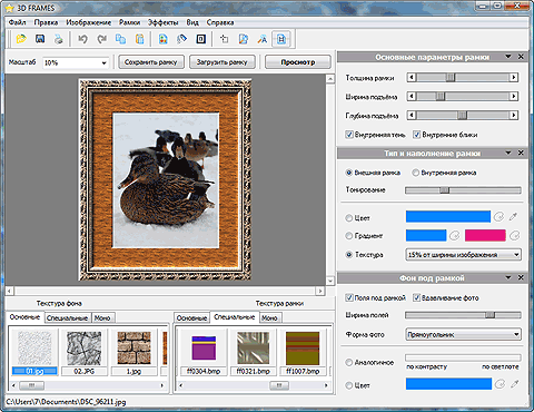 Теперь вернемся к программе с названием 3D FRAMES. Она больше похожа на конструктор рамок, чем все остальные, хотя и здесь есть готовые шаблоны. Но все же и шаблонные заготовки можно изменять - здесь имеется подстройка цвета фона под цветовую гамму основной рамки. С помощью специального элемента управления вы можете регулировать цвет фона, делая его светлее или темнее цвета внешнего обрамления. Есть возможность наложения на рамку теней и бликов.