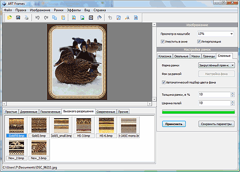 Теперь о том, какие отличия в программах при работе с рамками. Начнем с ART Frames. Кроме обычных прямоугольных рамок здесь можно создавать и овальные. Длинная сторона овала автоматически располагается вдоль большей стороны изображения. Как ее развернуть - неизвестно. Есть и варианты рамок, называемых "сложные", - это шести- и восьмиугольные, а также прямоугольные с закругленными краями, но радиус скругления вручную подобрать нельзя - устанавливается автоматически.