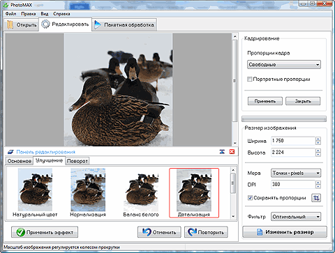 Второй набор функций - "Улучшение". В него включено пять функций для автоматического улучшения фотографий - "Нормализация", "Натуральный цвет", "Баланс белого" и другие. Так, функция "Детализация" может значительно улучшить качество изображения, "вытянув" детали и повысив резкость различных объектов.