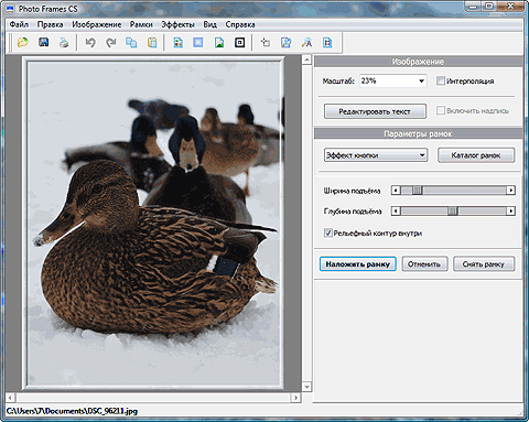 С помощью других параметров можно сделать рамку более выпуклой или плоской, широкой или узкой. Рамки можно формировать как внешние, так и внутренние. Внутренняя рамка имитирует стеклянное полупрозрачное обрамление. Преимущество внутренних рамок в том, что они не меняют пропорции фотографии, что удобно для печати. Уровень прозрачности в данном случае регулируется с помощью ползунка "Тонирование". Любую из сделанных рамок можно сохранить для дальнейшего использования.