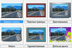 Каждая программа включает определенный набор подготовленных рамок, распределенных по нескольким категориям, а также маски и границы. Большая часть рамок входит в состав всех этих программ - "деревянные", "простые", "позолоченные", "современные", "высокого разрешения" и "прочие". Отличаются они лишь размещением на рабочем поле программы и различным оформлением окна настроек. Принцип же работы с шаблонами рамок одинаков.