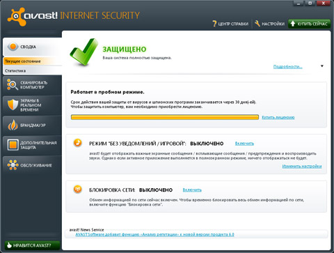 Итак, что мы в видим в рабочем окне программы? Шесть основных вкладок в левой колонке, три - в правом верхнем углу. В левом нижнем углу располагается кнопка “Нравится Аваст?”. С помощью нее можно рассказать об антивирусе знакомым через Facebook, Twitter либо посредством электронной почты. Также можно ознакомиться с отзывами других пользователей, оставить собственный либо подписаться на официальные каналы avast! в социальной сети Facebook, блогах Twitter и Blog.com.