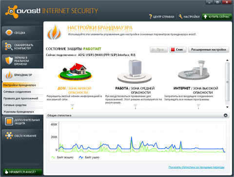 “Настройки брандмауэра” - контролирует все рабочие сети. Для упрощения контроля каждой рабочей сети нужно присвоить один из трех режимов: “Работа”, “Интернет”. Не стоит сравнивать встроенный в avast! брандмауэр с профессиональными решениями - с ними ему не потягаться. Однако он на порядок лучше брандмауэра Windows.