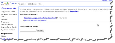Пока обновляется база DNS, надо сказать "Гуглю", какую страницу показывать пользователю, пришедшему на наш сайт по адресу ghs.google.com. Для этого заходим на сервис "Сайты" под учетной записью, под которой мы создавали наш сайт, идем в меню "Дополнительные действия"/"Управление сайтом", в разделе "Настройки сайта" выбираем пункт "Веб-адрес". В поле "Добавление веб-адреса" вводим