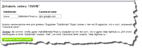 Делается это в панели управления доменом в разделе "Добавить запись CNAME". Эта запись (canonical name) говорит, куда отправлять пользователя при запросе нашего сайта (subdomain www) по доменному имени. Из документации Google известно, что направлять их надо на ghs.google.com. Обновление информации в записях DNS требует времени - наш домен должен прописаться по всей огромнейшей базе, на что уходит до суток.