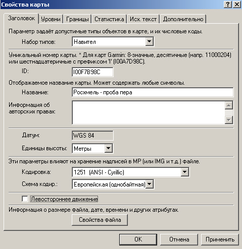 Установим набор типов объектов создаваемой карты для соответствующей навигационной программы ("Навител", Garmin, RUSSA и некоторых других). Дадим имя нашей карте. Установим кодировку для имен объектов. Создадим уровни детализации карты. Последняя настройка определит, как будет выглядеть карта при разном приближении, а также сколько таких уровней будет.