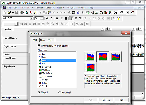 Поскольку материалы, выполненные в MapInfo, часто используются не только в электронном, но и в бумажном виде, в виде карт, атласов, отчетов или данных для анализа, в программе имеется встроенный инструмент Crystal Reports, который позволяет выбрать необходимую аналитику в базе данных и представить ее в виде удобоваримых табличных отчетов. Есть и удобный механизм подготовки карт к печати, чтобы она выглядела именно картой, а не набором линий и полигонов на чертеже.