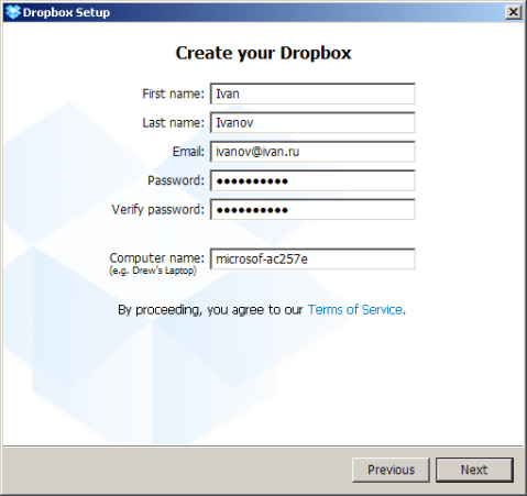 Если вы уже имеете учетную запись, нужно будет указать e-mail, пароль и также название компьютера. Как вы могли догадаться, заморочка с последним связана с тем, чтобы сервис мог определить, откуда были произведены изменения файлов.
