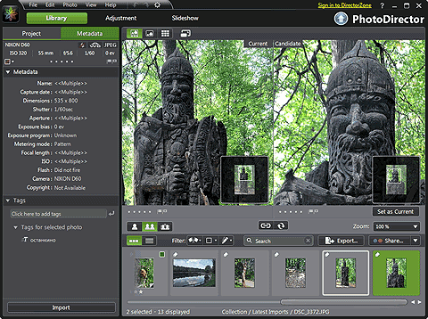 Панель предварительного просмотра показывает уменьшенные копии ваших фотографий, входящих в выбранную вами подборку текущего проекта. Выделение любой из них показывает ее в панели работы. И здесь есть одна интересная особенность. В окне для работы с фотографиями можно вывести одновременно две фотографии. Удобно для выбора наиболее интересной из двух подобных, либо для сравнения изменений, которые приобретает фотография после обработки, с исходной. Но можно вывести и большее число фотографий, если выбрать режим множественного просмотра - добавление фотографий в рабочее окно выполняется простым щелчком по фотографии в панели предварительного просмотра.