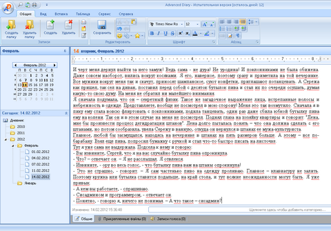 Работа в программе начинается с подключения к базе данных – все ваши записи будут храниться в ней. По умолчанию используется файл стандартной базы данных – он лежит в папке с установленным Advanced Diary и называется diary.ddb (DDB является внутренним форматом программы). Вы можете использовать эту базу дальше, переименовать и переместить ее или создать для себя новую в меню «Управление базами данных». В этом же меню можно подключать базы данных после переустановки операционной системы или используя программу на другом компьютере. Если вы хотите, чтобы записи в вашем дневнике никогда и никуда не потерялись, внимательно следите за сохранностью файла базы данных, отметьте в настройках создание резервных копий. Защитить их можно не только от потери, но и от посторонних глаз – достаточно установить на базу данных пароль: его будет нужно вводить при каждом запуске программы или даже после того, как вы свернули ее в трей.