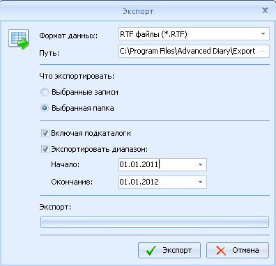 Advanced Diary работает с форматами TXT, RTF, HTML и своим собственным DDB. Для импорта достаточно указать папку, из которой следует «проглотить» все файлы выбранного формата, шаблон отображения даты (она будет извлечена из атрибутов создания файла) и папку в дневнике, куда требуется осуществить импорт. При экспорте можно выбрать не только папки, записи из которых вы хотите преобразовать в другой формат, но и временной диапазон – например, от 1 января 2011 года до 1 января 2012 года. Эта функция позволит объединить в одном документе вашу историю за определенный период жизни. Стоит сказать, что экспортировать прикрепленные к записям файлы и аудиозаметки можно лишь в формат программы DDB.