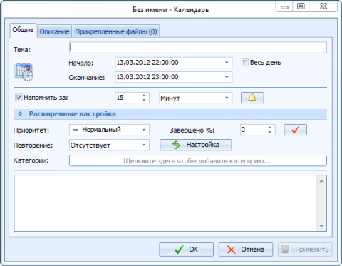 Данный модуль предназначен для создания списков задач, которые вы собираетесь выполнить в определенные дни. При создании новой задачи выбирается дата ее начала и окончания. Дополнительные настройки те же, что и в назначениях, кроме того, что напоминание настраивается не «до наступления», а в конкретное время. Стоит сказать, что напоминание во всех модулях работает одинаково и может оповещать всплывающим сообщением с проигрыванием звука (на экране, в трее либо электронным письмом), открывать программу или документ и выключать/перезагружать компьютер.