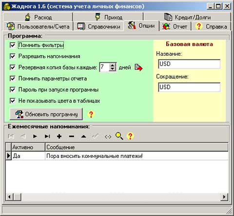Кроме всего прочего, с помощью окна настроек "Жадюги" вы можете скрыть ваши данные от посторонних глаз, указав пароль доступа к системе. Также прямо там можно настроить ежемесячные оповещения о необходимости выполнения тех или иных действий. Например, о сроках выплат по кредитам, коммунальных платежах и тому подобных вещах.