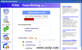 Опубликована новая версия программы для дефрагментации жесткого диска. IObit SmartDefrag 4.01 Beta работает по-принципу "установил и забыл". После установки IObit SmartDefrag 4.01 Beta переходит в автоматический режим работы и незаметно для пользователя и производительности системы дефрагментирует файлы во время обычной работы компьютера. Таким образом достигается высокая производительность файловой системы, так как файлы не разбиваются на фрагменты. IObit SmartDefrag 4.01 Beta не только дефрагментирует файлы, но и упорядочивает их расположение относительно друг друга для более быстрого чтения. На сайте разработчика не удалось обнаружить списка внесённых в эту версию изменений. ОС: Windows 2000/XP/Vista | Многоязычный интерфейс | Бесплатно.