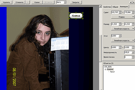 Помимо набора фотографий, которые являются объектами слайда, на слайде можно размещать объекты и иных видов. Это - фреймы (в них можно помещать иные объекты), кнопки, надписи, прямоугольники. С ними можно выполнять точно такие же действия, как и с дополнительными фотографиями, - надписи могут "наезжать", увеличиваясь в размере, и пропадать, кнопки будут реагировать на нажатия, фреймы будут показывать скрытые фотографии и снова их прятать. Результат будет ничуть не хуже, чем при создании презентаций с помощью MS PowerPoint.