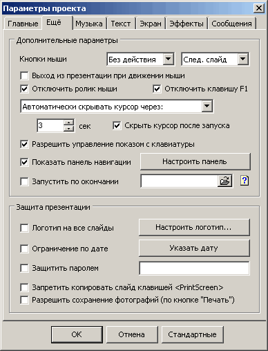 Вы можете защитить свою презентацию - паролем, временем использования, показом логотипа на слайдах, запретом копирования с помощью клавиши PrintScreen. В свойствах проекта можно указать музыкальный файл для сопровождения показа слайдов. На слайдах можно выводить дополнительные надписи, а их общие свойства (шрифт, тени, место отображения) можно настроить в свойствах проекта.