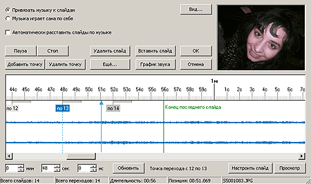 А теперь пришло время настроить собственно презентацию. В окне слайдов, отобранных для презентации, вы можете поменять их местами, удалить лишние или добавить новые. Это все просто. Сложности начинаются тогда, когда вы решите подключить к вашей презентации музыкальное сопровождение. Почему сложности? Можно обойтись и без них - как назначили смену кадров, так она и будет идти вне зависимости от музыкального сопровождения. Но это самый простой вариант. Интереснее сделать так, чтобы смена кадров подчинялась музыкальному темпу, смене мелодии, слов.