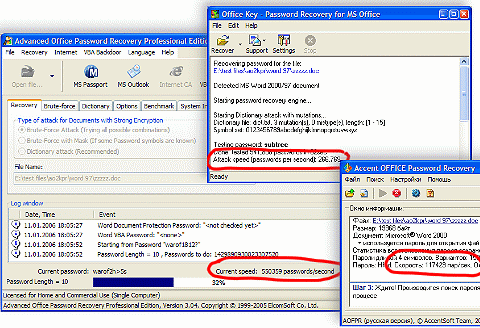 Хотя сравнительный анализ программ не является нашей целью, все же нужно сказать, что работают программы "Элкомсофта" значительно быстрее упомянутых выше зарубежных аналогов и других подобных программ, и это является их основным преимуществом. "Скорострельность" элкомсофтовских программ доказана тестами от независимых исследователей, с некоторыми отчетами которых можно познакомиться на www.password-crackers.com. Однако и самостоятельно проверить это никто не мешает.