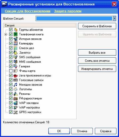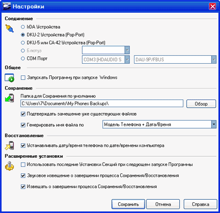 Начнем, как всегда, с настроек. Они несложные. Во-первых, вы должны определиться со способом подключения телефона к компьютеру. Надо выбрать папку, куда будут записываться резервные копии информации, и способ формирования имени резервного файла (обычно используют номер модели и дату, на которую формируется резервная копия). Кроме этих базовых настроек есть еще расширенные установки. Здесь представлены все поддерживаемые информационные разделы, которые могут присутствовать на телефоне, начиная от телефонной книги до игр, радиостанций, заметок и так далее.