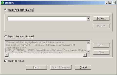 Импорт возможен как из reg-файла, как обычно, так и из буфера обмена (естественно, при соответствующем синтаксисе), при этом есть специальный режим импорта, именуемый Import as a Tweak. Этот режим предназначен для более простого использования особых настроек для оптимизирования работы. В случае импорта данных как твика создается отдельный "снимок" реестра и затем запускается сравнение между ним и текущей версией. После чего при помощи кнопки Undo into registry данные могут быть занесены в реестр, а при помощи Redo into registry они откатываются к первоначальным значениям. В комплекте программы есть пять примеров твиков - в папке /Tweaks.