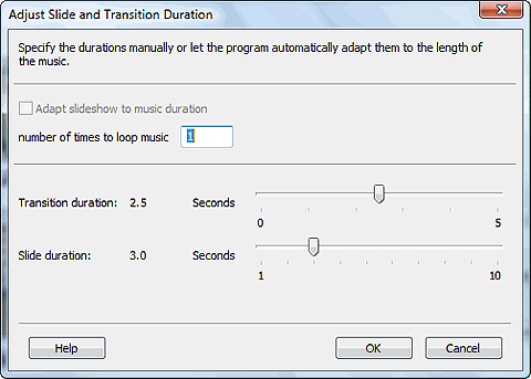 Как дополнительный эффект можно использовать зуммирование фотографий - в этом случае сменяемая фотография либо будет выводиться на экран в полном размере с последующим уменьшением на 10-20 процентов, либо, наоборот, начальный вариант будет на 10-20 процентов меньше окончательного. Также можно настроить длительность эффекта смены и длительность показа каждой фотографии. Настройка этих параметров для отдельно взятых фотографий не предусмотрена. Но можно добавить в проект музыкальное сопровождение - выбрав один или несколько аудиофайлов. (Эти файлы, как и файлы изображений, затем будут записаны на один и тот же диск.)