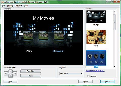 Следующий шаг - создание меню для выбора слайд-шоу, которые будут записаны на диск (в одном проекте может быть несколько различных презентаций, связанных друг с другом только через общее меню). Здесь вы можете выбрать один из вариантов заставки, которая будет отображаться на мониторе или экране телевизора при просмотре через DVD-плеер. Управление меню осуществляется стандартными средствами плеера или, при просмотре на компьютере, с помощью мышки или клавиатуры.