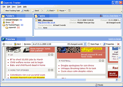 При выборе страницы, для которой были найдены изменения, откроется либо сама страница, либо список сохраненных и не просмотренных ранее вариантов страницы, для каждого из которых будет показано количество новых слов, ссылок или изображений. (В том случае, если сохраненных вариантов более одного, добавится возможность просмотра совокупного варианта изменений.) Выбрав любой из вариантов, в панели просмотра можно будет увидеть проверяемую страницу, на которой цветом будут выделены новые элементы. Так можно будет очень легко найти, что же изменилось на ней с момента последнего просмотра.