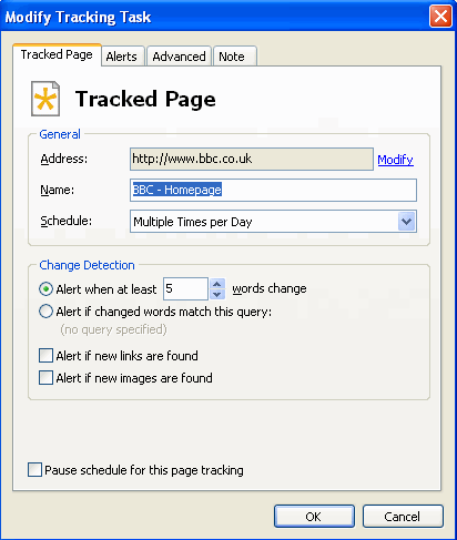 Добавляя новую страницу в список отслеживаемых, необходимо установить определенные параметры. Адрес страницы заполняется автоматически, как автоматически вносится информация по названию страницы, но это название вы можете отредактировать под себя. В дальнейшем можно изменить и адрес страницы, если вы увидите, что удобнее отслеживать изменения по другой странице сайта. Вы можете указать, при каком количестве измененных слов вам будет направляться извещении о том, что страница изменилась. По умолчанию информирование начнется после того, как программа обнаружит на странице пять новых слов, но это число легко изменить. Впрочем, здесь нужно указать об одном существенном недостатке. Отслеживание изменений оказалось возможным только для страниц на латинице. Проверка изменений на русскоязычных ресурсах приводит к ошибке The character set in which this page is encoded is not supported by Copernic Tracker.