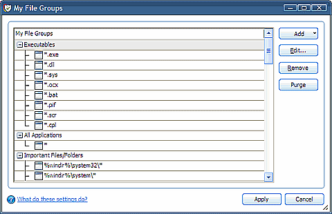 Более того. Программа позволяет создать перечень файлов, доступ к которым любых процессов или иных пользователей будет полностью запрещен. Но здесь нужно понимать, что включив в этот перечень исполняемый файл, вы запретите кому бы то ни было запускать его на выполнение до тех пор, пока файл не будет исключен из перечня заблокированных. Для того чтобы добавить файл в первую или вторую группу, можно использовать интерфейс My File Groups, в котором присутствуют наиболее часто используемые типы файлов, системные и иные разделы, наиболее часто подвергаемые атакам. Но любой файл можно добавить в перечень и обычным образом, через аналог проводника.