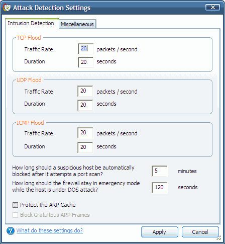 Файрвол обеспечивает распознавание наиболее известных типов внешних атак. Для настройки параметров обнаружения атак предназначен специальный раздел. В нем устанавливаются параметры, по которым программа может выявить один из трех типов атак - TCP, UDF или ICMP (по умолчанию установлен порог в 20 пакетов в секунду в течение 20 секунд). При выявлении атаки программа блокирует доступ к компьютеру и открывает к нему доступ по истечении установленного в настройках времени. Но анализируется не только количественная характеристика пакетов. Вы можете включить и проверку пакетов на соответствие протоколу, по которому они приходят, а также некоторые иные проверки.