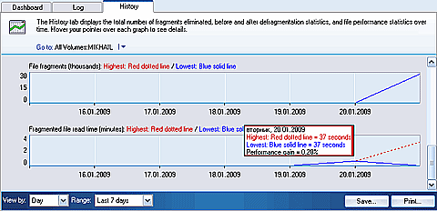 Программа относится к классу "установи и забудь" - предполагается, что после установки программы и первоначальной настройки пользователю больше не потребуется обращаться к ней для выполнения ее задач. При установке программы происходит установка сервиса, отвечающего за взаимодействие операционной системы и отдельных компонентов программы. Этот сервис обеспечивает возможность работы программы в фоновом режиме с использованием технологии InvisiTasking. Эта технология в новой версии получила дополнительное развитие - существенно улучшилась работа программы в фоновом режиме даже в тех случаях, когда параллельно выполняются и другие ресурсоемкие программы. В основном окне программы в любой момент можно посмотреть график использования системных ресурсов. Там же можно настроить и ограничения на время работы программы с тем или иным диском, а также указать, для каких дисков дефрагментация будет выполняться в автоматическом режиме.