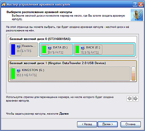 Архивная капсула - это специфическое понятие, используемое в программе. Оно обозначает специальное безопасное место на жестком диске, имеющее независимую системную структуру (выделенный раздел), который остается работоспособным даже в случае повреждения активной файловой системы. Капсула может быть создана как первичный раздел или логический диск внутри расширенного раздела в любом месте жесткого диска: в конце (предпочтительный вариант), в начале или между другими разделами. Такие работы могут быть выполнены только опытным пользователем во избежание возникновения проблем с работой с существующими дисками. Для предотвращения случайного удаления или неавторизированного доступа к резервным данным раздел скрыт и, таким образом, не может быть подключен в операционной системе.