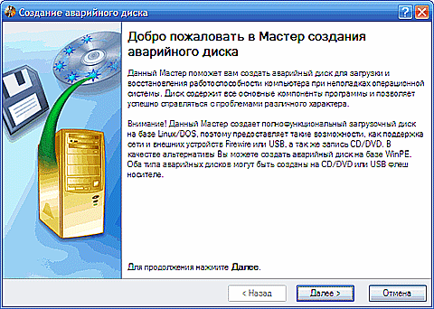 В процессе работы программа предоставляет возможность выполнить реорганизацию структуры жесткого диска. Поэтому, чтобы не потерять данные, рекомендуется перед началом использования создать резервные копии данных и загрузочный диск. Подобное сохранение данных желательно выполнять во всех случаях, когда возможно изменение конфигурации дисков или разделов. Загрузочный (аварийный) диск, который формирует программа, выполнен на базе Linux/DOS. С его помощью можно получить доступ к жесткому диску без участия установленной операционной системы. И даже в том случае, если операционная система повреждена, можно будет выполнить резервное копирование информации, попробовать восстановить загрузку системы, выполнить восстановление раздела из имеющейся резервной копии и так далее. Аварийный диск - не новость, новинка в том, что с помощью программы Drive Backup 9 его можно создавать на флеш-диске (лишь бы ваш компьютер поддерживал загрузку с такого устройства).
