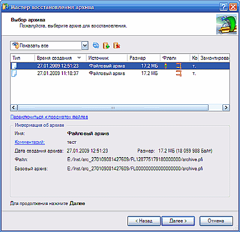 Все сформированные архивы заносятся в базу данных программы. Поэтому выбор архива для восстановления можно выполнить либо выбором нужного архива из этого списка (а здесь еще можно установить фильтр на тип архива), либо поиском файла архива на диске. И тот, и другой вариант показывают для архива всю необходимую информацию - и дату его создания, и размер, и базовый архив, если выбран архив дополнения. Можно просмотреть и комментарии, которые были внесены в момент создания архива. Восстановление файлового архива возможно как в исходный раздел (в этом случае требуется указать, что делать с имеющимися в разделе файлами), так и в новое расположение.