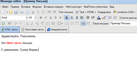Для формирования самих писем рассылки в программе есть собственный редактор. По своим возможностям и интерфейсу он напоминает всем знакомые редакторы, но есть и отличия. Вот на них и остановимся подробнее. Тип письма может быть только текстовым, в виде HTML или смешанным. Есть закладка предварительного просмотра. Но у меня не получилось увидеть в ней полный текст письма в случае выбора смешанного типа.