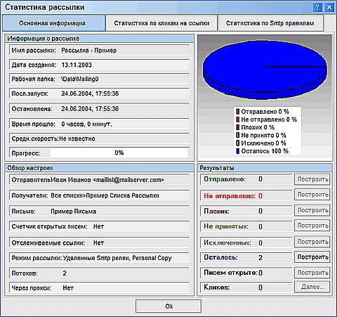 К динамическим составляющим рассылаемых писем можно отнести вставки, отвечающие за ведение статистической информации о действенности рассылок. Эта статистика позволяет оценивать эффективность проводимых рекламных акций на основании данных о количестве открытых получателями писем, а так же переходов по ссылкам, указанным в письме. Принцип работы статистики состоит в следующем: в процессе генерации писем программа подставляет ссылки на веб-сервер, на котором вы должны будете установить специальный скрипт, накапливающий статистику. Для получения информации об открытых письмах программа вставляет в конец письма ссылку на не видимую картинку, которая должна скачиваться с этого сервера. Скачивание картинки определяет, открыл получатель письмо или нет. Принцип, по которому программа отслеживает переходы по ссылкам работает примерно так же - вместо прямой ссылки на рекламируемый ресурс программа вставляет ссылку на сервер, собирающий статистику, и в качестве одного из аргументов для скрипта указывает URL рекламируемого ресурса.
