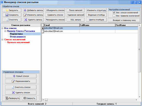 В дополнение к основным возможностям управления списками, программа поддерживает работу с правилами исключения отдельных e-mail адресов из рассылок. Специальная группа "Список исключений" содержит e-mail адреса, на которые не должна отправляться рассылка. Если в каком-либо листе рассылки есть адреса, которые так же содержатся в группе "Список исключений" - в процессе рассылки эти адреса будут проигнорированы и письма на них отправлены не будут. Эта группа позволяет задать правила исключения записей из рассылки. Правила исключений позволяют анализировать содержание любых полей списков рассылки и на основании этого принимать решение - отправлять почту или нет (к примеру, можно исключить из рассылки все адреса, начинающиеся на слово "admin").