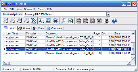 Следующая сетевая утилита также предназначается для администраторов или сотрудников службы безопасности. Это - Print Inspector. После установки программы и подключения через нее к любому сетевому принтеру (при наличии администраторских прав) пользователь получает возможность видеть всю картину использования печатных устройств - кто, когда и что печатал, в каких количествах, сколько листов, в какое время. Если в настройках ввести данные по стоимости печати одного листа, можно получить и данные по стоимости этих работ.