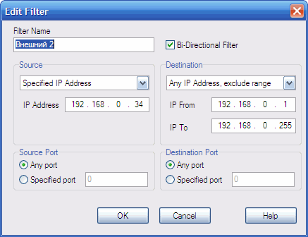 Отчеты о расходовании трафика формируются за счет назначения фильтров. Каждый из сформированных фильтров определяется адресами источника и назначения и дополнительно может учитывать порты. В качестве адресов могут использоваться адрес локального компьютера, произвольно назначаемый сетевой адрес, последовательная группа адресов, группа адресов, за исключением одного конкретного, либо любые адреса, за исключением любой последовательной группы. Таким образом можно сформировать фильтр для учета всего трафика, принимаемого или отдаваемого конкретным компьютером, трафика локальной сети либо внешнего, интернет-трафика. Задача становится неразрешимой в рамках одного фильтра, когда необходимо указать несколько исключаемых адресов либо несколько диапазонов. Такая возможность в создании фильтров не предусмотрена.