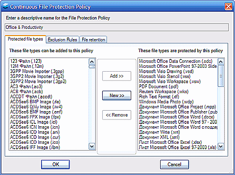 После создания хранилища необходимо определить, какие файлы будут в него помещаться и каким образом. Реализуется такая задача за счет создания политик резервирования. В каждой политике определяется несколько важных моментов - какие файлы будут резервироваться, какой метод резервирования при этом будет использоваться и как долго должны храниться предыдущие версии. Программа поставляется с предварительно настроенным набором политик, в которых определены способы резервирования наиболее общих типов файлов, таких как документы MS Office, графические изображения, электронная почта. В процессе работы эти политики можно изменять, либо создавать заново. Изменение политик не повлечет за собой удаление уже заархивированных файлов, но лишь изменит правила архивирования в последующем. За исключением версии Lite, которая работает только с первоначально заданными политиками и единственным способом архивирования.