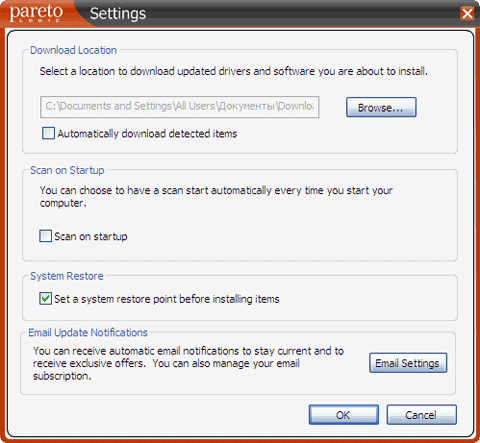Установка и настройка программы проблем не вызывают. Рекомендую в настройках убрать отметку о необходимости автоматической загрузки обнаруженных новых версий драйверов и программ. Автоматическая закачка может привести к резкому увеличению использованного трафика, что могут позволить себе не все пользователи. Лучше запускать закачку обновлений вручную и только для тех продуктов, которые вы решите обновить. К сожалению, настройки не позволяют выбрать только те типы драйверов, для которых вы хотели бы выполнять автоматическую проверку версий. Первоначальное сканирование выполняется для таких типов, как драйверы операционной системы, звуковых и видеоплат, драйверов принтеров и мониторов, драйверов сетевых карт и иных устройств, которые программа обнаружит на вашем компьютере. Также в настройках программы рекомендуется выбрать выполнение создания контрольной точки состояния системы перед тем, как будут проинсталлированы обновления драйверов.