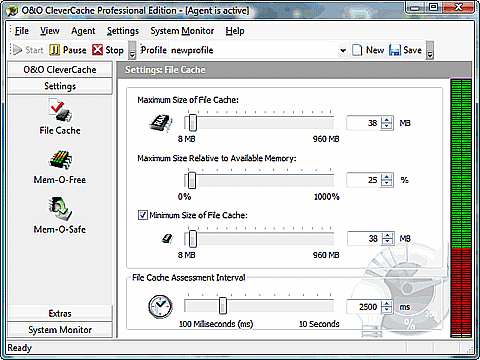 Хотя программа вполне успешно работает без донастроек, любознательные пользователи могут в дополнение к трем базовым неизменяемым настройкам добавить собственные, установив для них свои параметры работы с памятью и файлами. Например, можно определить максимальное и минимальное значения файлового кеша, объем всегда свободной оперативной памяти, временной интервал между помещением файла в кеш-память и его записью на диск и т. п. Результаты настройки отображаются в окне встроенного модуля Cache Monitor.