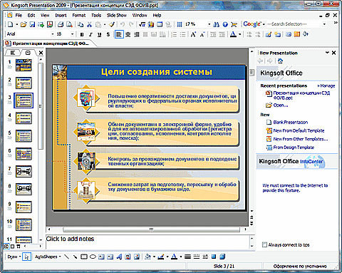 Редактор электронных таблиц, программа для работы с презентациями - похожи на своих "старших" братьев в такой же степени, как и текстовые редакторы. И имеют такие же небольшие отличия. Форматы, в которых сохраняют документы программы Kingsoft, полностью идентичны форматам MS Office. Даже новые форматы - docs и иные - нормально воспринимаются ими, но сохранять в этом формате возможности пока нет.