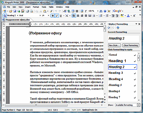 Первое впечатление от интерфейса - хорошо знакомый Office 2003. В английском его варианте. Большинство иконок точно таких же, хотя встречаются и "самодельные" - например, для включения показа скрытых управляющих маркеров. Но после того, как поработаешь в новом интерфейсе Office 2007 возврат к более старому варианту не особенно нравится. Например, привык использовать возможности всплывающей инструментальной панели - а в редакторе Writer 2009 такого нет. Вроде бы, пустяк, но к хорошему (удобному) привыкаешь очень быстро.