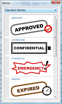 Следующий элемент - штампы. С их помощью можно ставить на документе определенные пометки. Например, конфиденциальность, резолюцию, дату и время. Целый набор штампов имеется в программе, но пользователь всегда может создать и свой собственный, включив в него и рисунок, и надписи, а затем сформировать из подготовленных штампов группы для удобства поиска и использования. А наиболее используемые можно вынести в число фаворитов - тогда их легче будет выбирать.
